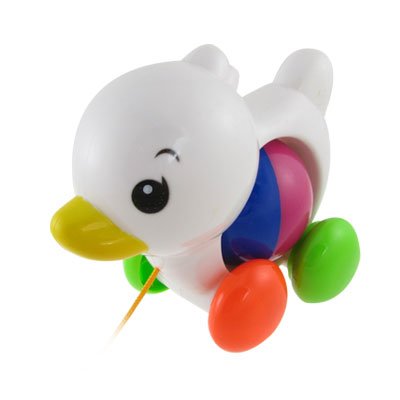 The Child Car Toy is duck shape car, white duck body, yellow mouth, four green and orange wheels, blue and magenta ball with beads inside. Yellow nylon string designed to tow the duck car toy. Characterized by tow the duck car toy, the wheels move ahead and the clear ball turn round with rattles. An ideal gift for child to play.