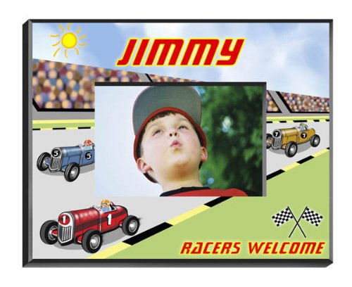 Wedding Favor - Bridal Shower Gift - Baby Shower Keepsake: If he loves fast cars and exciting races, he`ll love this bright colored racing picture frame, adorned with classic race cars of yesteryear. The racetrack design makes a perfect addition to a car-themed room or can be displayed with other racing memorabilia. The frame is a great personalized gift for your future racing star. Frame measures 8 x 10 and holds a 4 x 6 photo. First Name 15 characters Bottom Text to replace Racers Welcome - 20 characters
