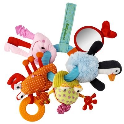 This "bunch of keys" consists of a teething ring and five water friends: Anouk the Penguin, Romeo the Toad, Oscar the crab, an octopus and a fish. Each of these characters is made in a different kind of material; they provide a bunch of activities and exciting noises.