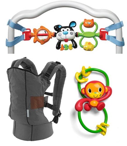 A great gift for a new mom! Includes fun rattle toys and a carrier ergonomically designed for all day comfort. Bundle includes:?Car Seat Buddies musical activity bar with spinning activities and lights that attaches easily to car seats?BPA free Go Bananas Rattle that features sliding bananas that make a fun rattling sound?SupportTM Ergonomic Cotton Carrier that features 2 easy carrying positions (facing-in cozy time and backpack exploring), a lumbar belt t provide supreme back support and eases shoulder strain, and padded head support for baby