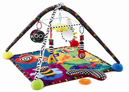 This playmat includes 17 activities. The electronic starlight mirror plays 20 minutes of continuous music and lights. Two guitar toys rattle to help develop sound location skills. The playmat features 2 peek-a-boo flaps with crinkle to promote cause and effect and soft grass to inspire baby's sense of touch using her feet. It also includes a tummy time bolster to help develop upper body muscles. Two two-sided crinkle disks engage baby's vision and sense of touch. A large Tru-Reflection Mirror engages baby's developing vision. There are bold, high-contrast colors and patterns everywhere baby looks. The Fast-Set canopy opens in seconds and easily attaches to a playmat with its large feet. You can promote physical literacy with the included Gymtrix DVD, which contains 5 fun developmental activities. The chewy teether helps develop baby's awareness of her mouth. It also includes 6 colorful links to attach toys to the playmat.
