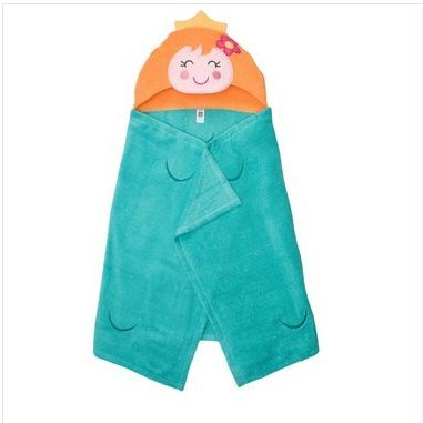 The soft adorable princess hooded towel has a turquoise "dress" and orange hair with a hot pink flower and yellow crown, it makes a great gift for a little girl. The towel is one size fits most and measures 50" x 27". The embroidered features on the pink face show a smiling little girl; it's all rolled up to measure about 13" x 10" x 3" and closed with a grosgrain ribbon. It is machine washable and dryable.