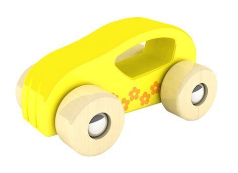 Child-sized wood vehicle with a burst of color and graphics in 4 vibrant colors and two designs: checkered or blossoms. Unique styling-color,style,graphics and natural wood wheels.