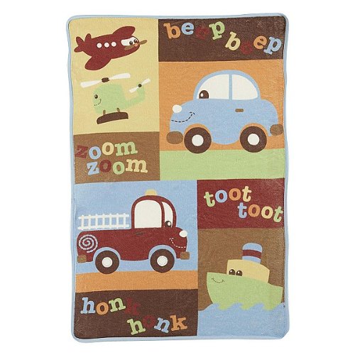 Welcome your little bundle of joy to the world with this cuddly baby blanket, featuring a transportation theme that coordinates with the On The Go collection. Finished size 30 in. L x 45 in. W. Machine Wash warm. Use only non-Chlorine bleach when needed. Tumble dry low. Remove promptly. Do not iron. 100% Polyester.